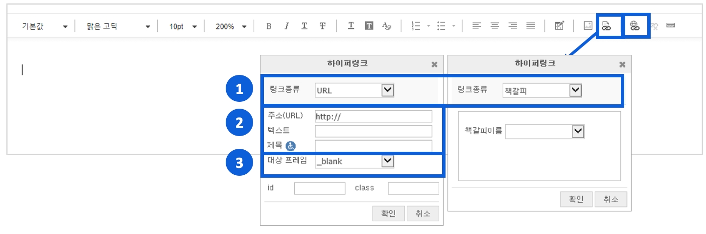 링크 종류 - 하이퍼링크로 연결 할 링크 종류를 선택해 주세요. - URL : 하이퍼링크로 연결할 위치를 주소(URL)로 지정해 주세요. - 책갈피 : 하이퍼링크로 연결할 책갈피의 위치를 지정해 주세요.