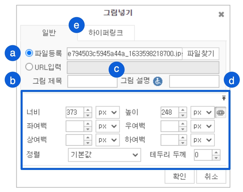 c. '그림 설명'은 이미지가 보이지 않을 때 표시되며, 그림의 대체 문구가 될 수 있는 간단한 의미를 입력합니다.