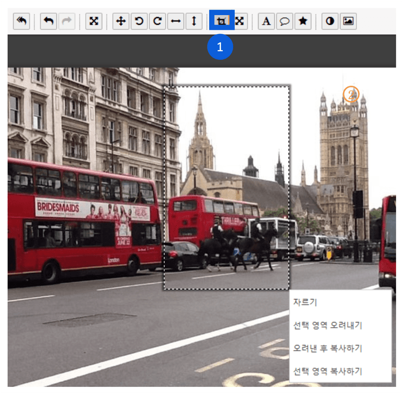 - 자르기 : 선택한 안쪽 영역만 잘라냅니다. 선택 바깥 영역이 편집 창에 남아있습니다.