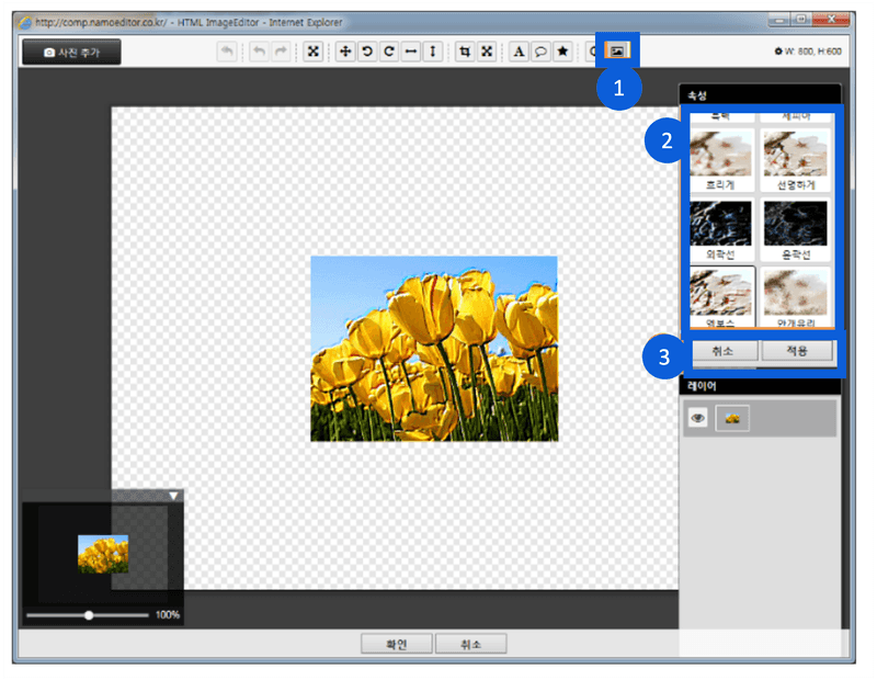 버튼을 클릭 합니다.속성 창에서 원하는 옵션을 선택합니다. 필터가 적용된 결과를 편집 창에서 바로 확인할 수 있습니다.