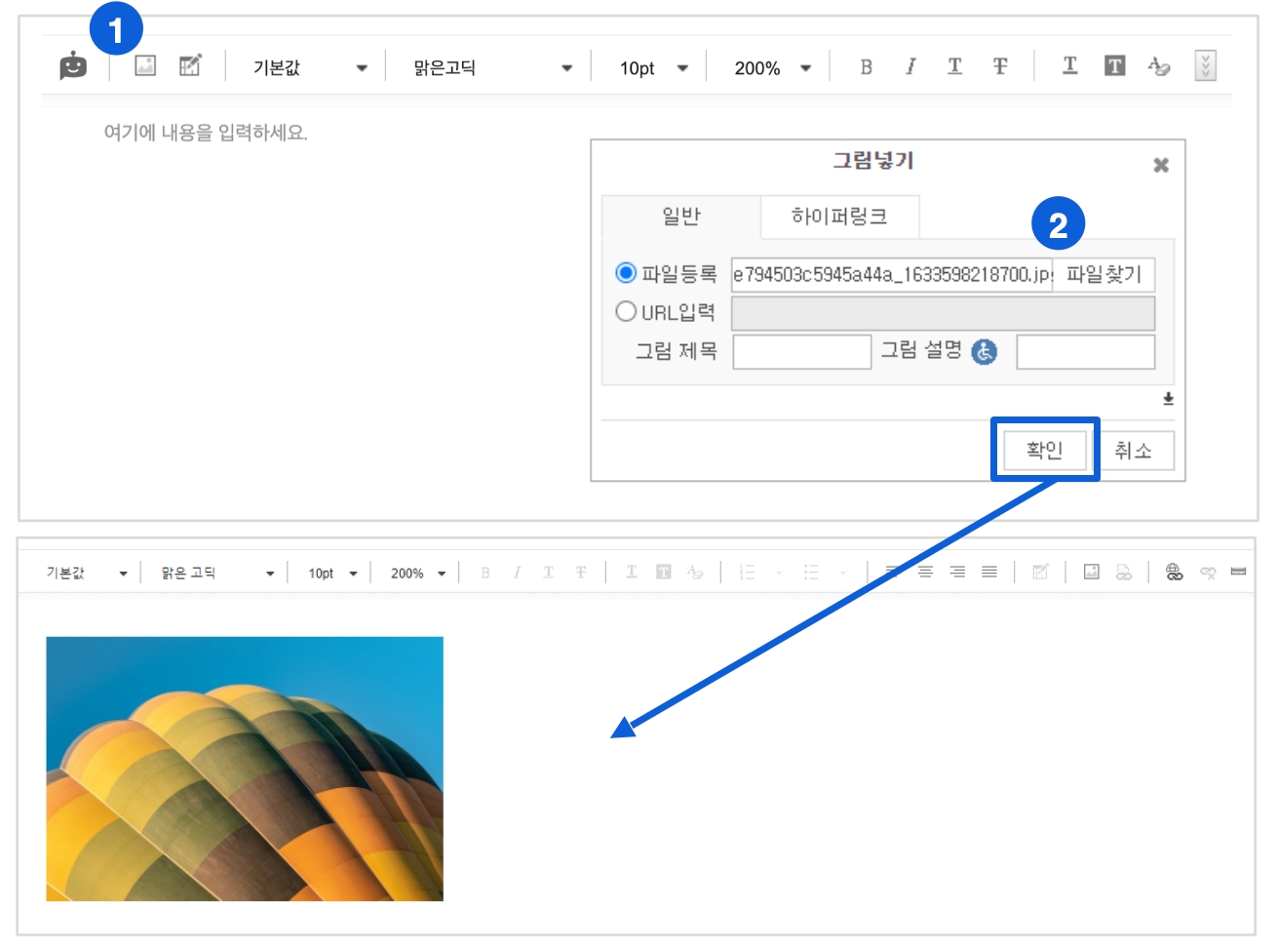 그림을 삽입 할 위치에 커서를 놓고 에디터 도구 바에서 [그림 삽입]