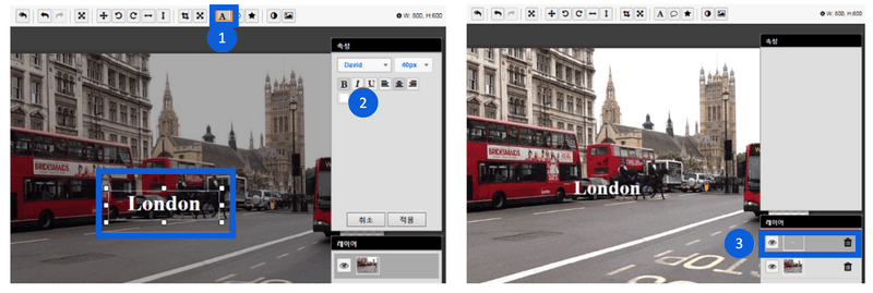 텍스트 버튼을 이용하여 편집 창의 사진 위에 원하는 텍스트를 덧붙일 수 있습니다.