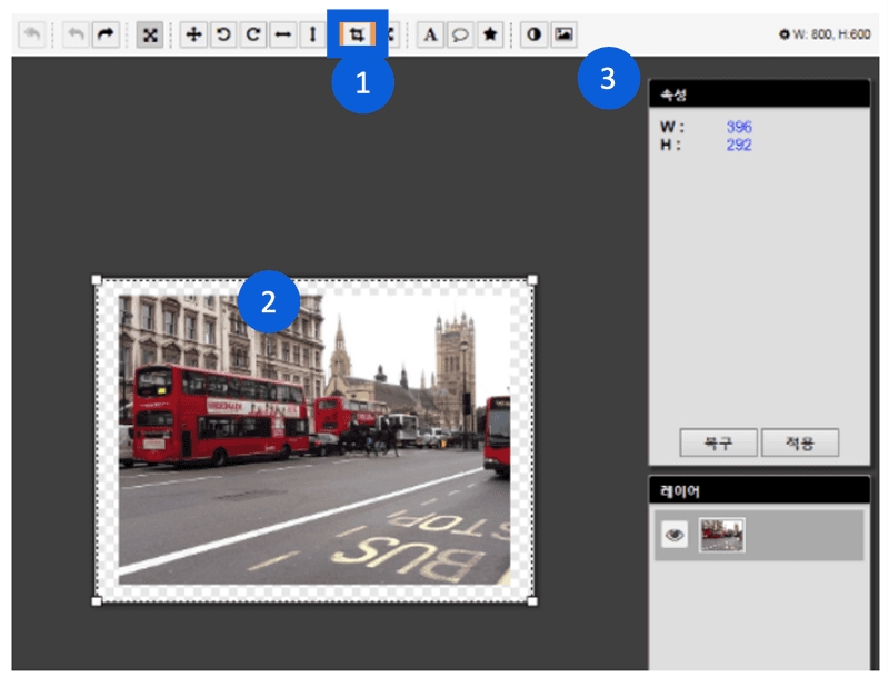 - 레이어를 선택한 뒤 원하는 위치로 드래그 하여 위치를 변경할 수 있습니다. 편집 창에 작업 중인 이미지를 [확대/축소]할 수 있습니다.