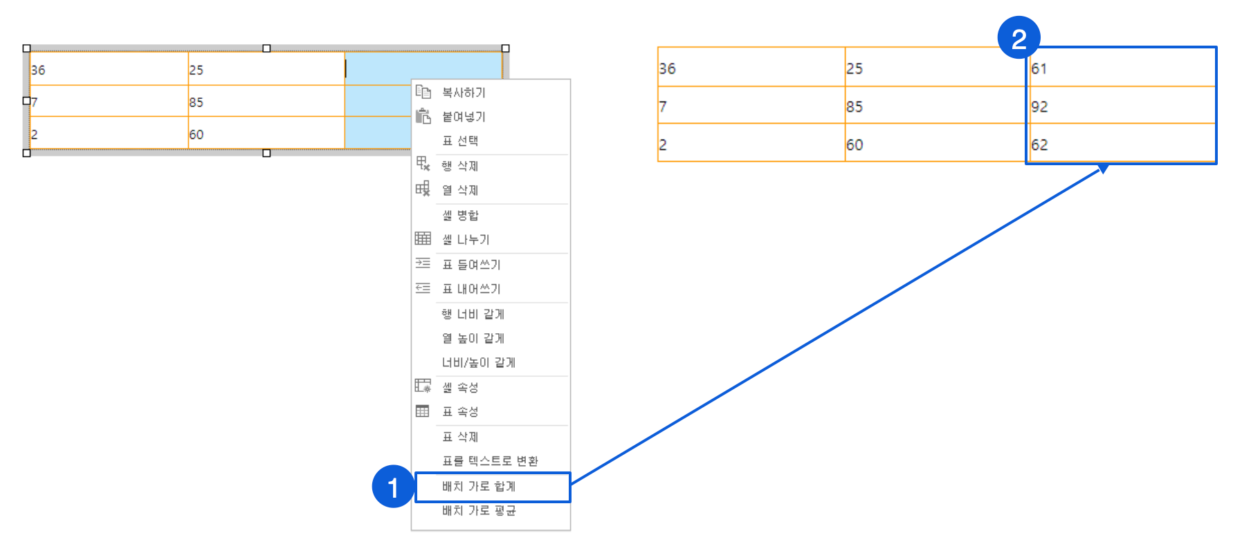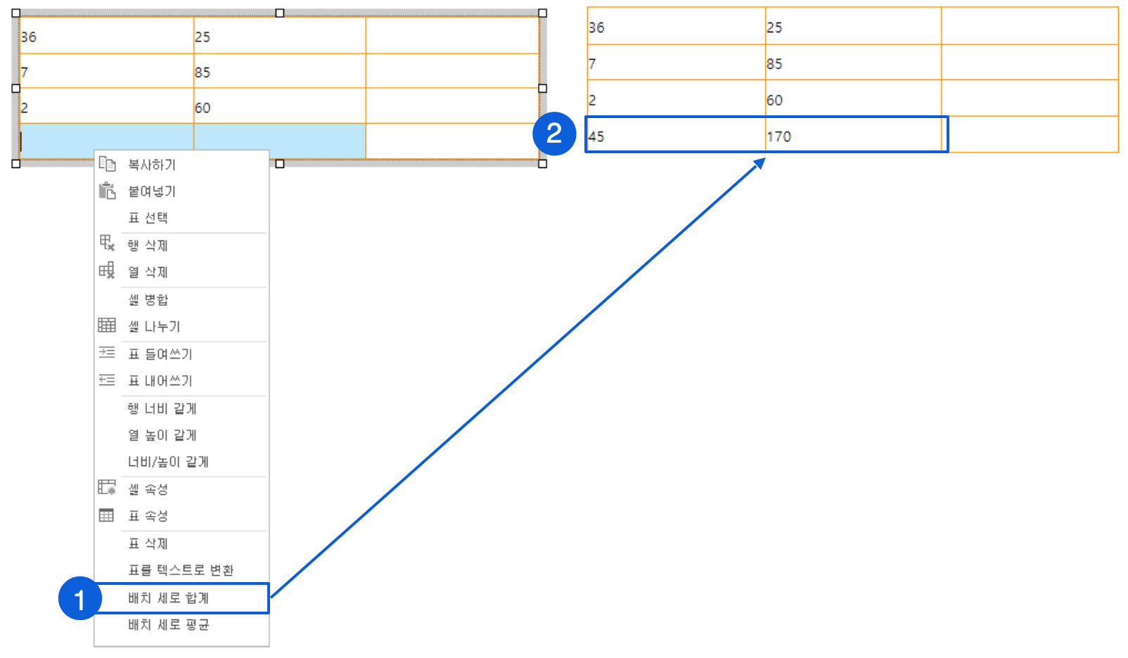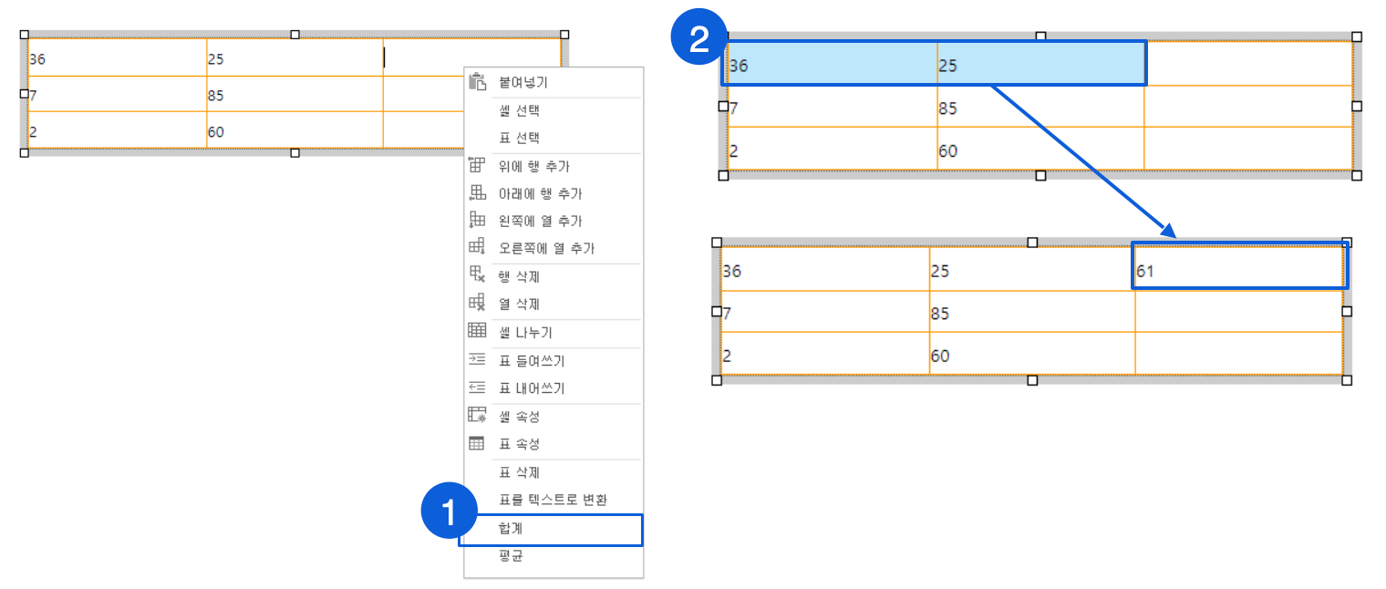계산 결과 값을 입력할 안에 커서를 놓고 마우스 우 클릭하여 '합계'를 선택해 주세요.