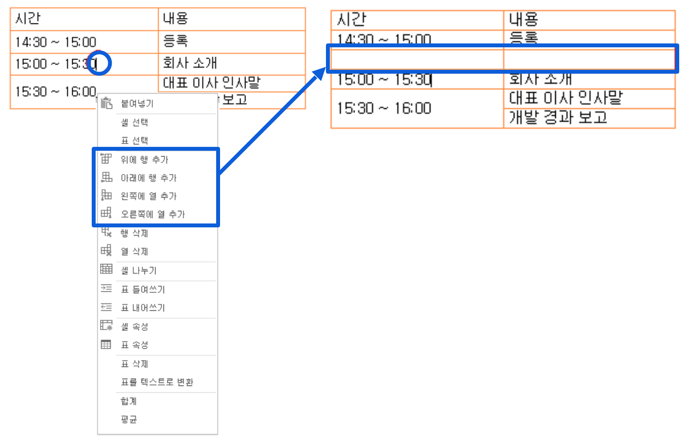 행/열을 추가 하려는 셀 선택 또는 마우스를 올려 놓은 뒤, 마우스 우 클릭하여 선택 메뉴를 실행해 주세요.