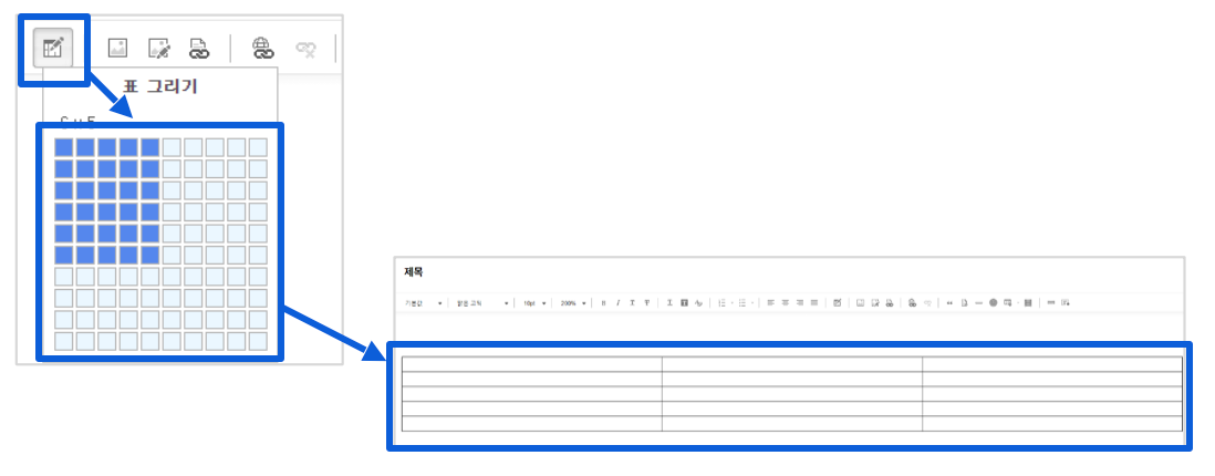 속성 팝업 : 표 만들기 팝업창에서 직접 수치를 입력하여 표 크기를 변경할 수 있어요.