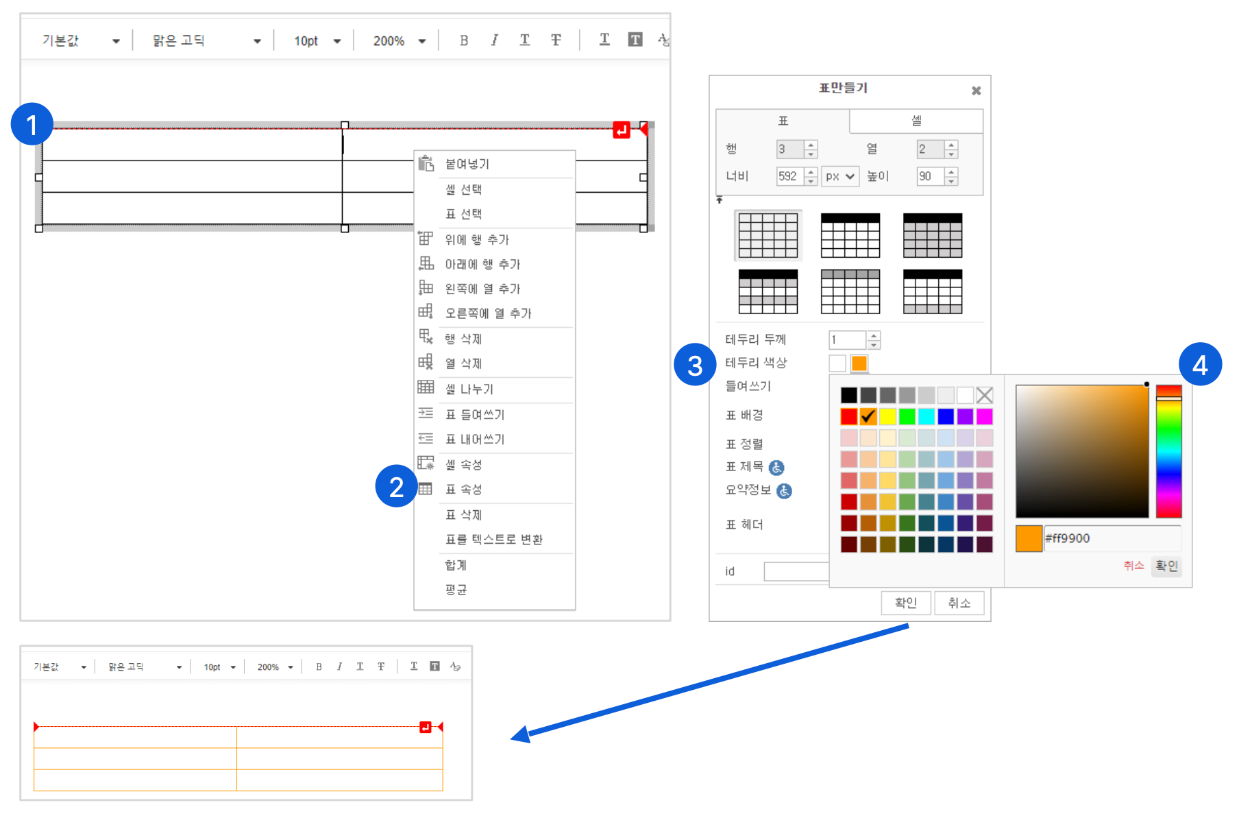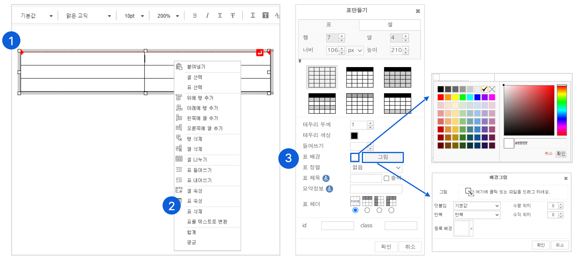 표 만들기 팝업창에서 ‘표 배경’에서 색상 또는 그림 버튼을 클릭해 주세요. - 배경 색 적용시