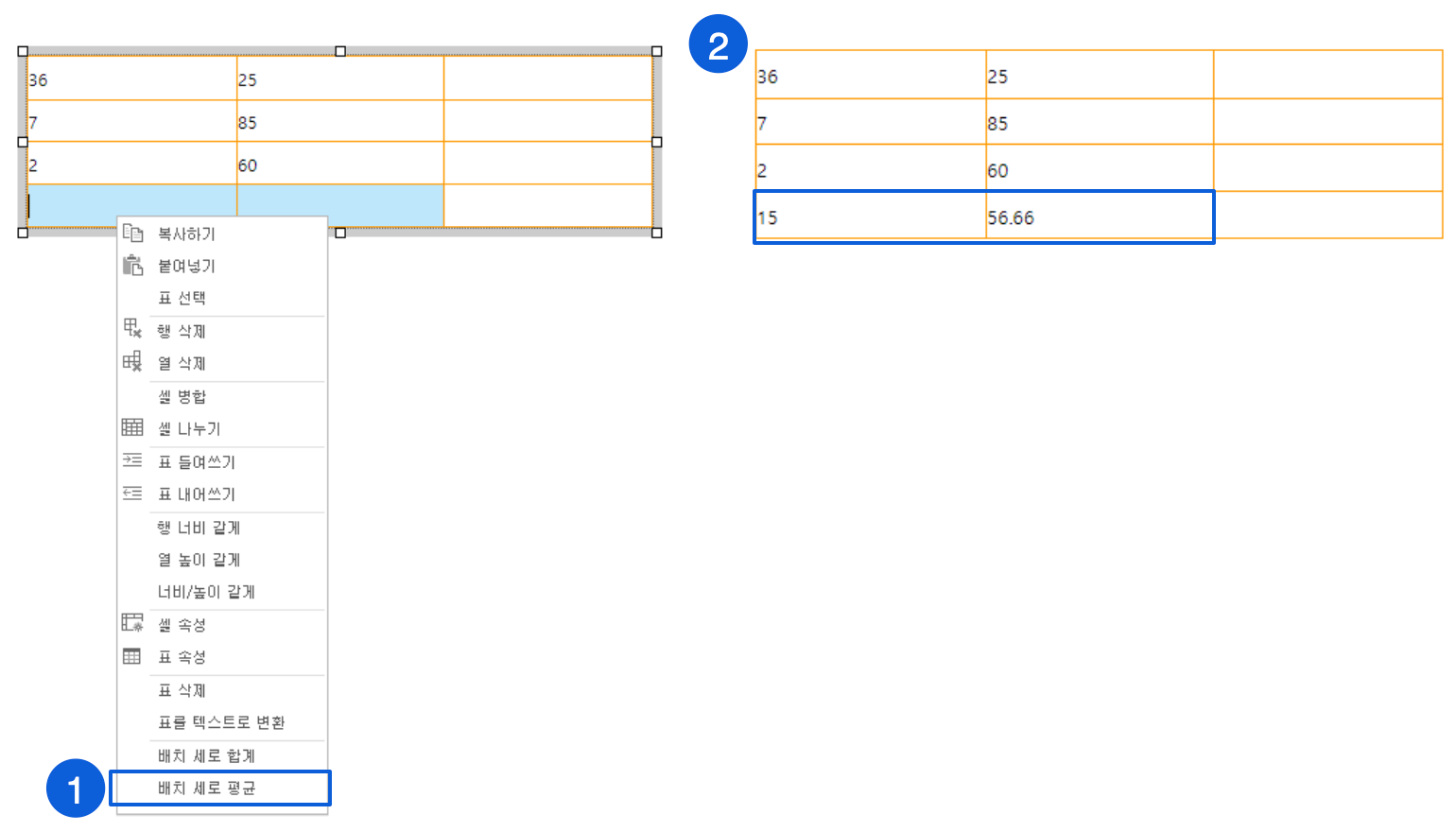 계산 결과 값을 입력할 안에 커서를 놓고 마우스 우 클릭하여 '평균'를 선택해 주세요.