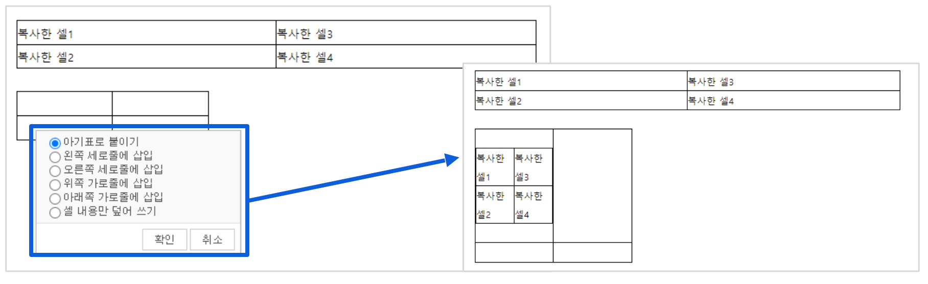 '행 또는 열을 추가'를 선택하여 실행해 주세요. - 행 추가: 위, 아래 - 열 추가: 왼쪽, 오른쪽